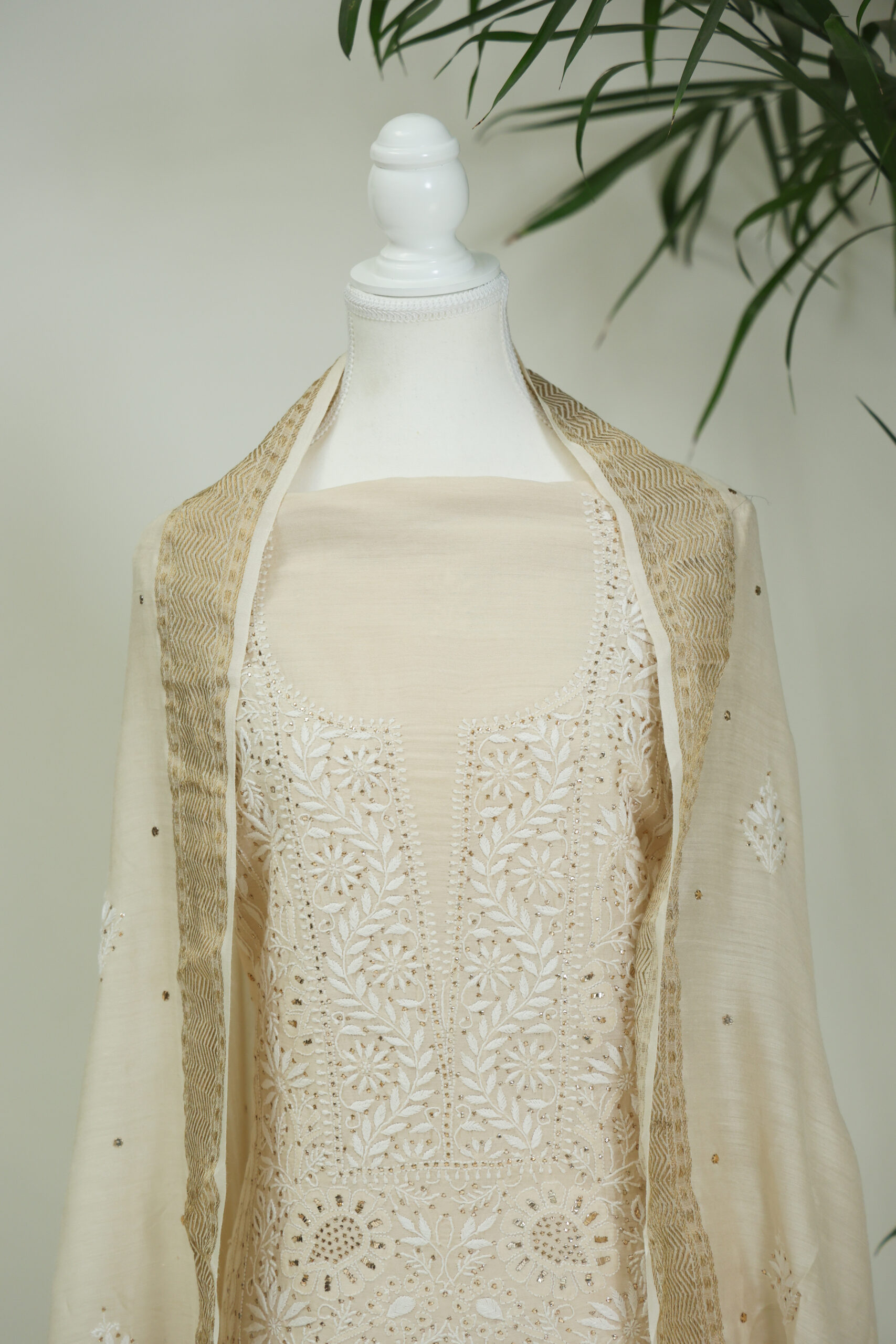 An enduring essential for those who love quiet elegance, this ivory kurta and dupatta set is crafted in pure georgette silk. Featuring delicate two-thread chikankari embroidery with aari, pearl, and sequin detailing, it balances tradition with modern style.