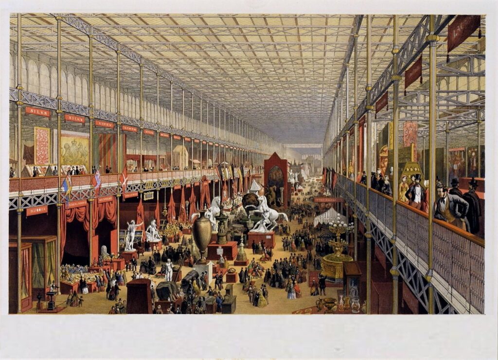 A contest for the design of the exhibition’s structure led to the selection of Joseph Paxton’s plans. The so-called “Crystal Palace” was a vast construction of cast-iron and glass, measuring over 1,851 feet in length (in honor of the year), encompassing more than 92,000 square meters—large enough to house mature trees and an 8-meter tall glass fountain within its dazzling halls.