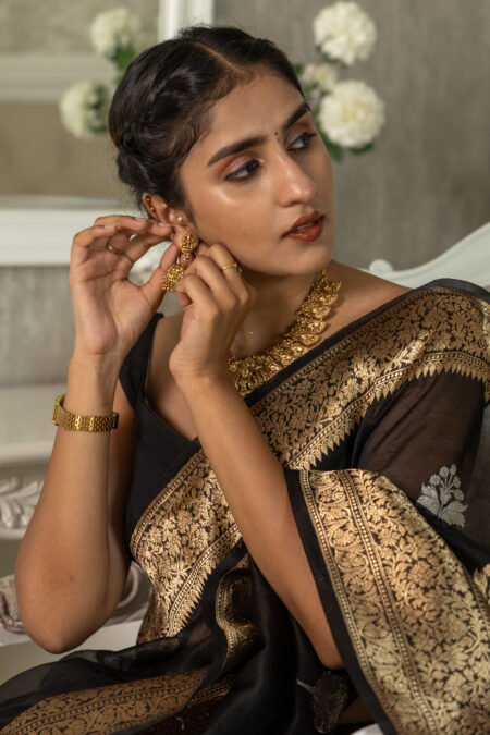 - Dimensions: Saree – 5.5 meters | Blouse – 1 meter with border (Black, unstitched)