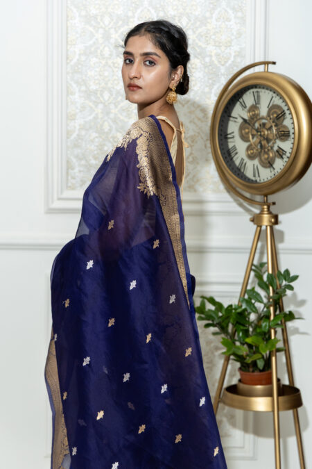 - Dimensions: Saree – 5.5 meters | Blouse – 1 meter with border (Midnight Blue, unstitched)