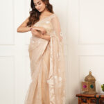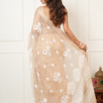 - Craftsmanship: Hand-embroidered white Chikankari motifs throughout — featuring classic floral jaal patterns. Embellished with light Mukaish work, offering a subtle shimmer. Borders and pallu gracefully embroidered for an elevated yet effortless drape