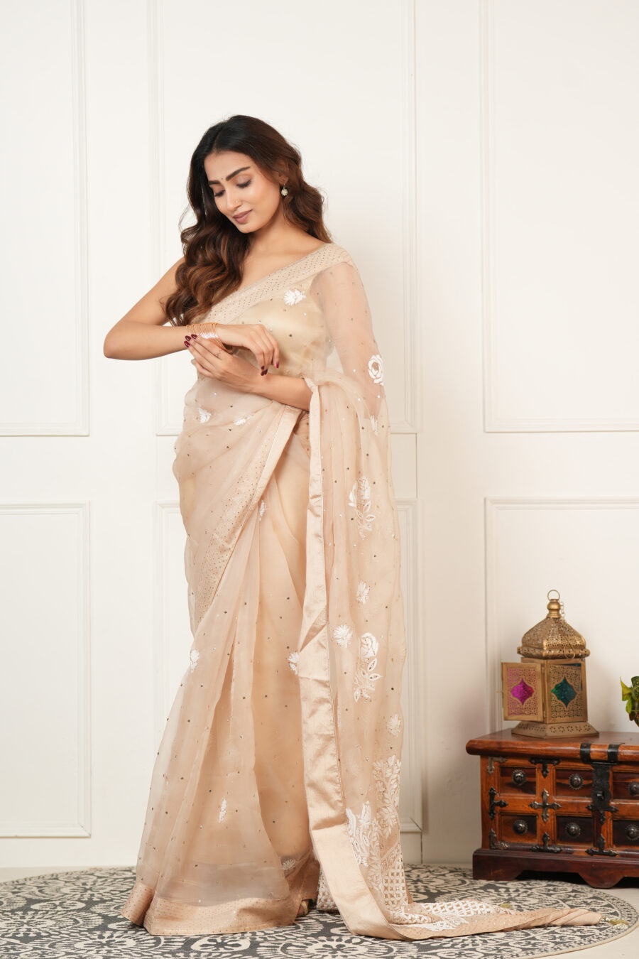 First Light: Peach-Gold Handcrafted Pure Organza Silk Chikankari Saree with Mukaish and Rose Motifs