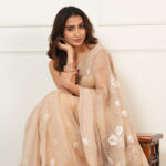 First Light is crafted on sheer, airy organza silk — detailed with delicate rose-pattern shadow work and sprinkled with mukaish embroidery that glimmers like half-told secrets in sunlight. The threadwork blooms gently, like a garden held close.