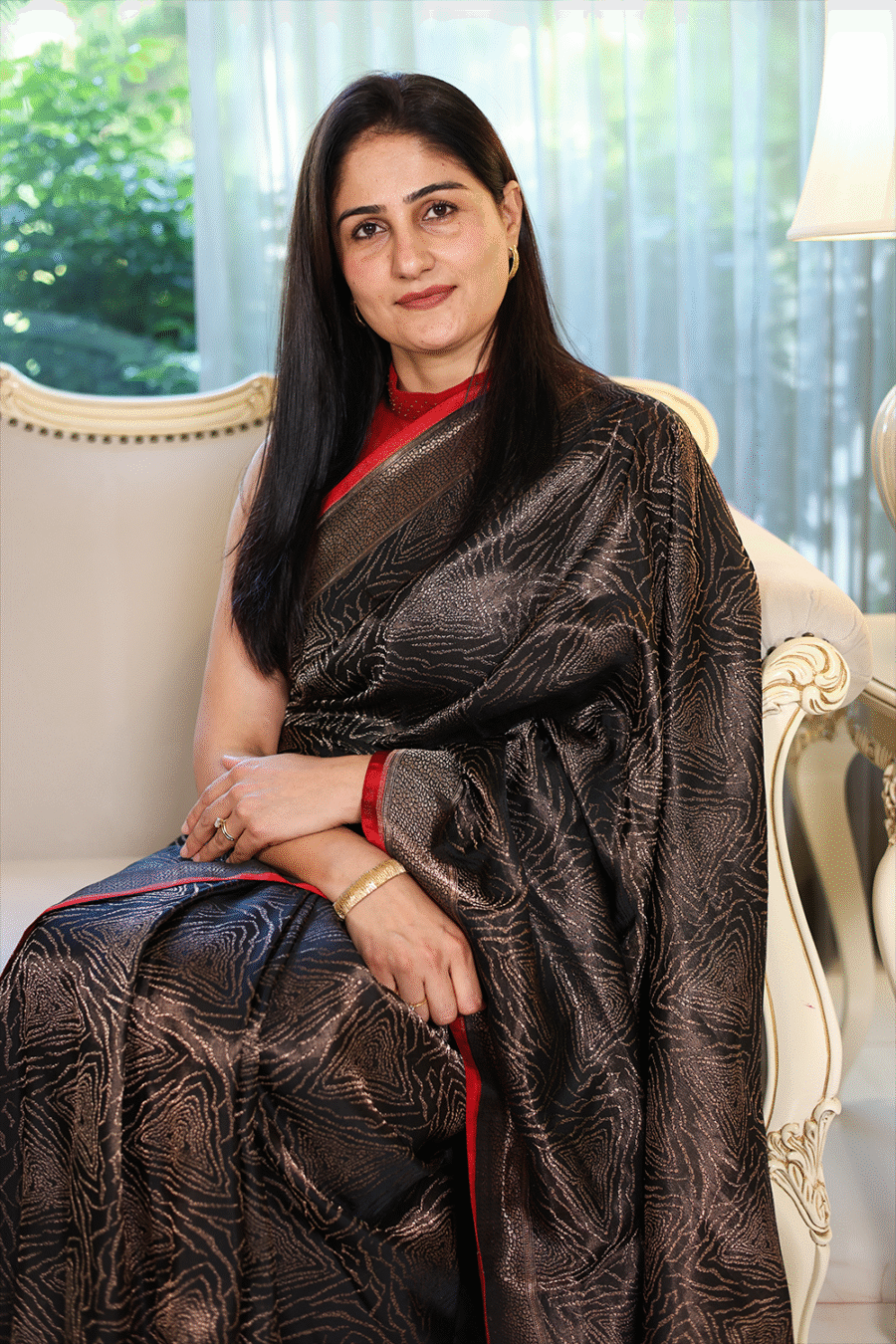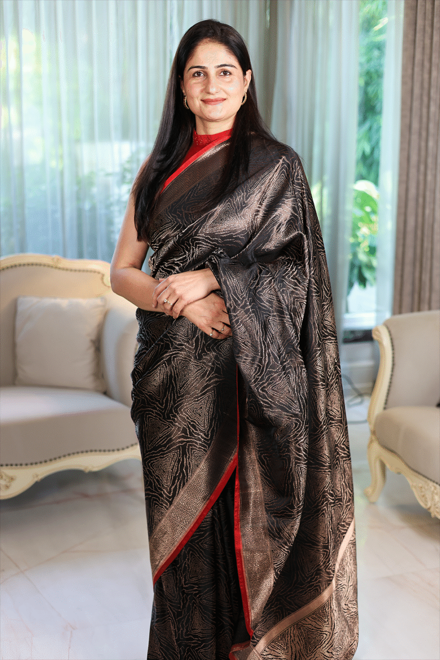 This saree is for the woman who commands presence with quiet confidence. Its rich black hue and intricate brocade speak of sophistication, while the Kadwa craftsmanship ensures it is a piece to treasure for generations. Draping it is not just wearing a saree — it’s owning a legacy of elegance and artistry.