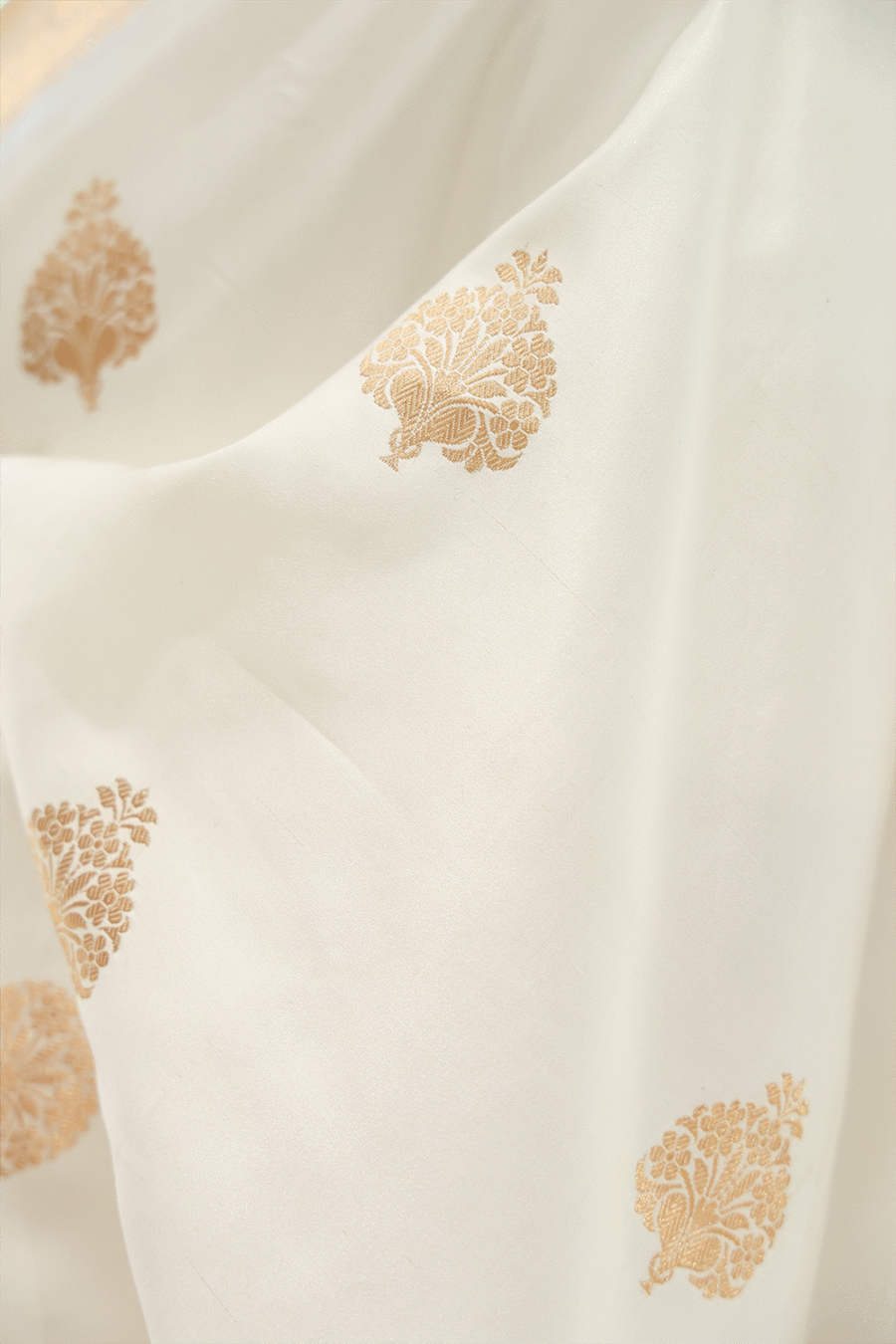Handwoven using the traditional Kadwa (Kadhua) technique, each boota is crafted individually, creating motifs with depth, clarity, and lasting strength. The delicate zari border adds a gentle glow, enhancing the saree’s minimal and sophisticated appeal.