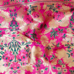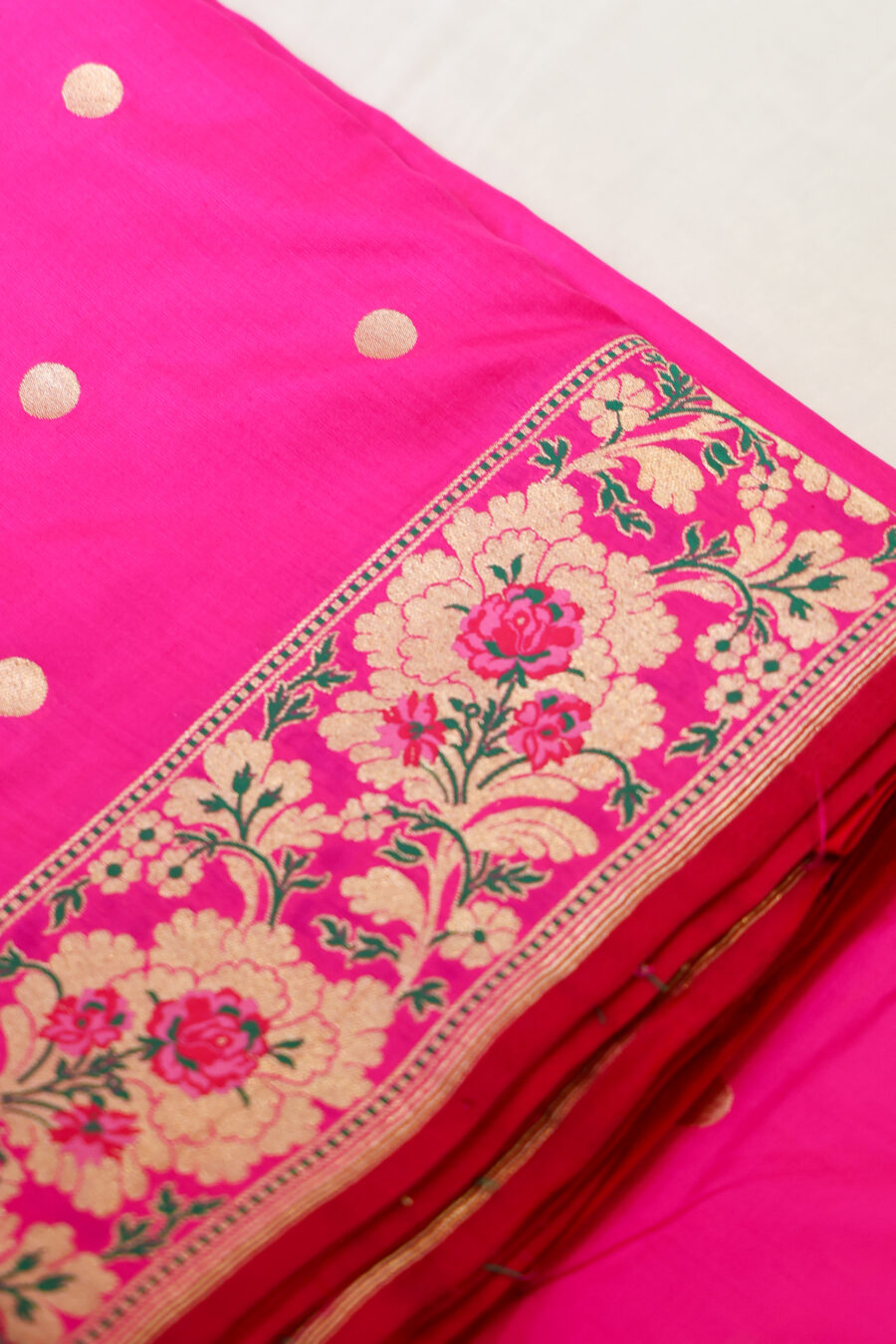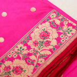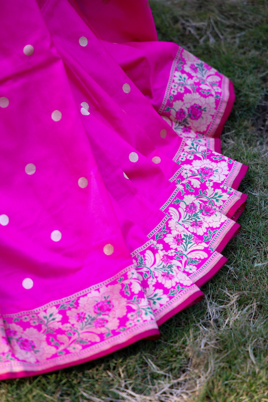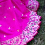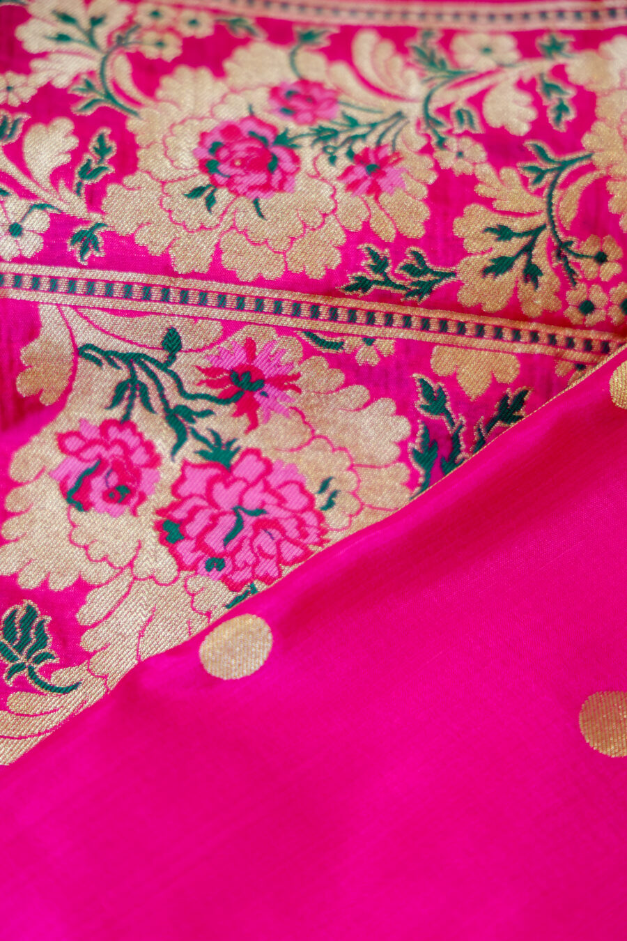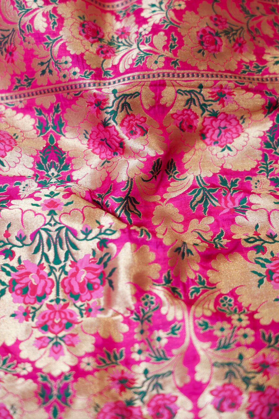 Celebrated for its depth, brilliance, and sculptural richness, Gyasar weaving is exceptionally difficult to execute and increasingly rare to source. Set against a regal Rani pink base, the saree radiates timeless grandeur, making it a true collector’s piece for connoisseurs of heritage textiles.