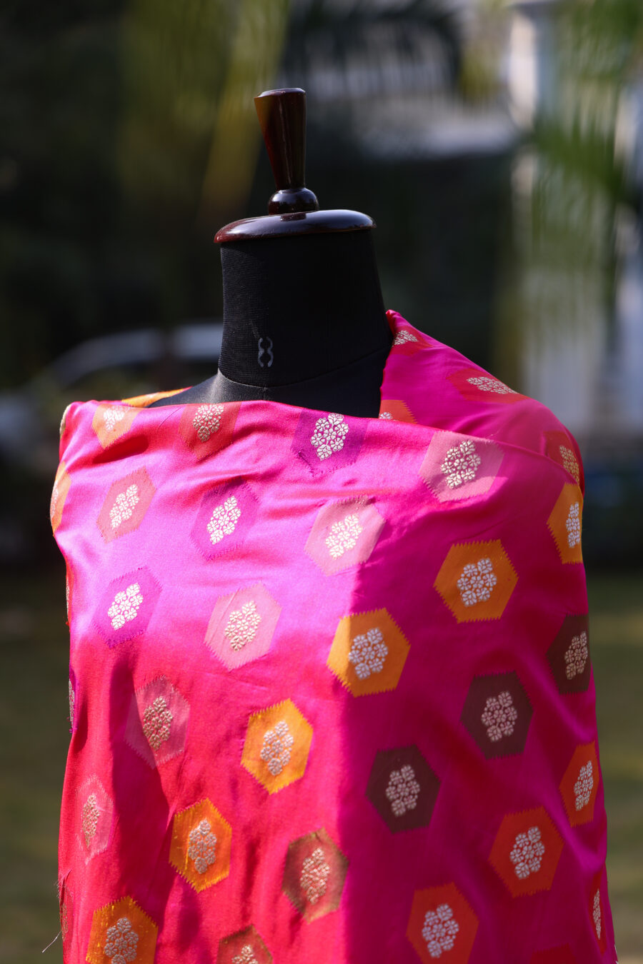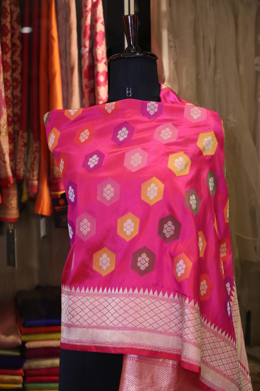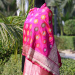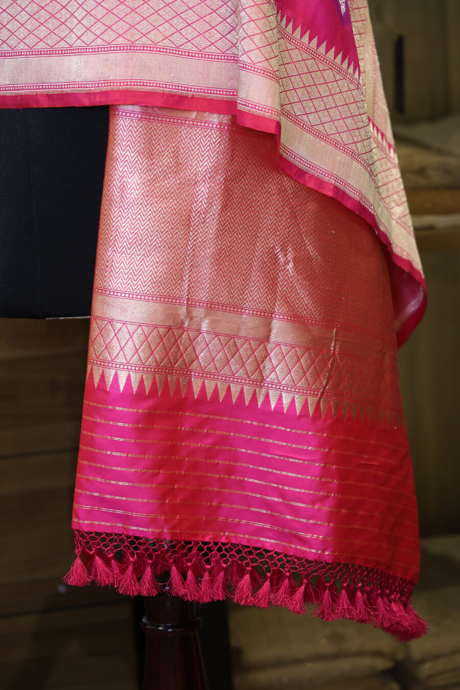 This exquisite Rani Pink Katan silk dupatta from our Rangkat collection is a celebration of masterful craftsmanship, woven using the intricate Kadhiyal Rangkat technique. The surface is adorned with delicate tilfi-meenakari floral motifs in soft hues of pink, yellow, and orange, arranged in a richly detailed multicoloured chowki pattern.